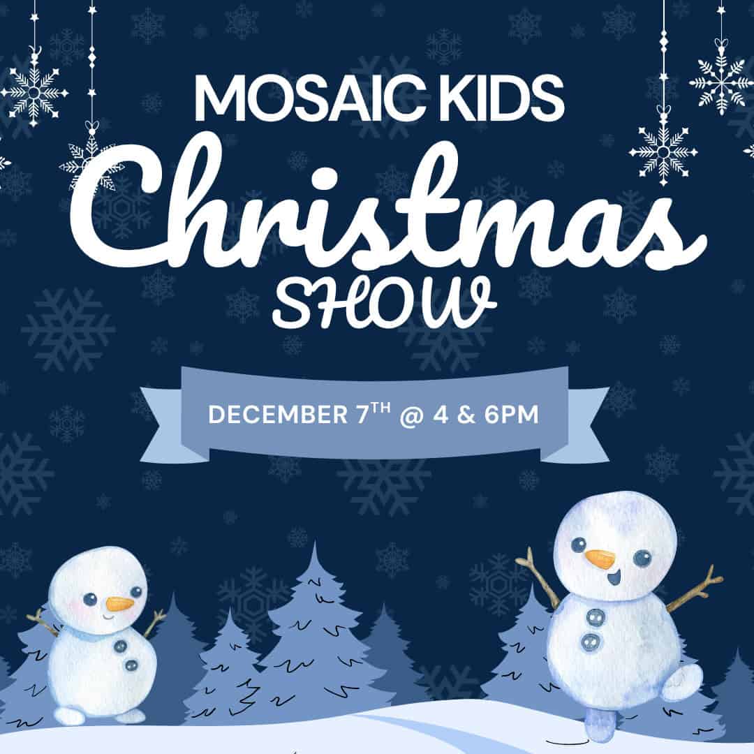 Come and support Mosaic Kids as they take the stage for the evening to kick off the Christmas season! Following each show, we will have cookies and refreshments for all.